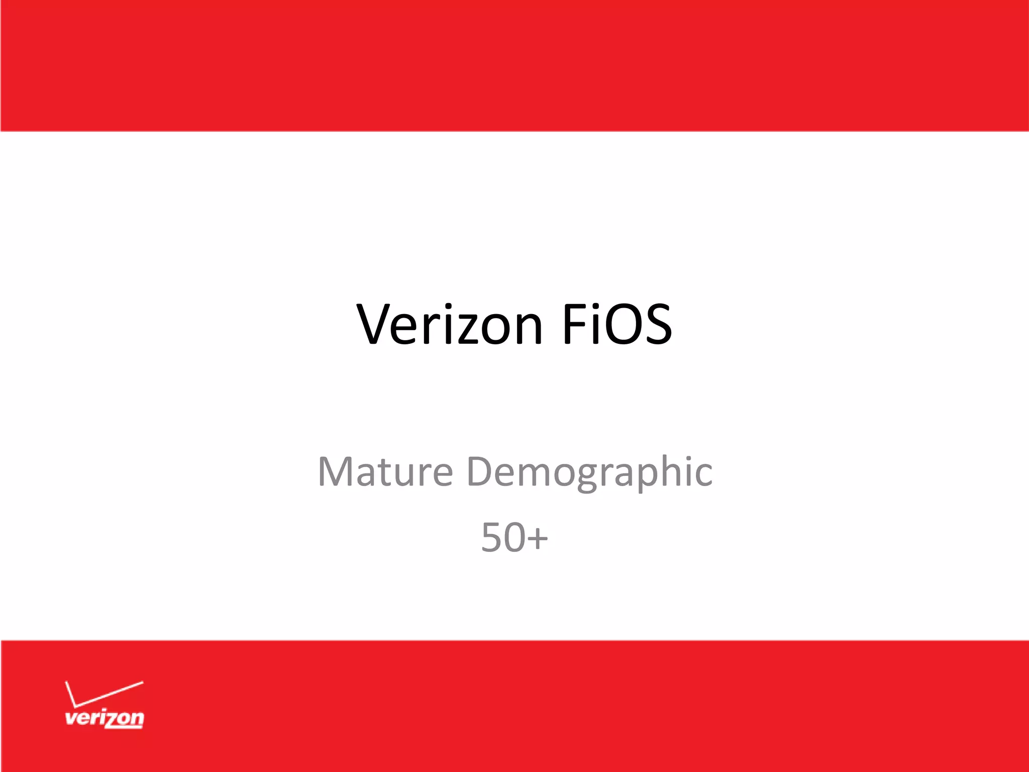 Verizon aims to increase market share of its FiOS services among mature customers in Pittsburgh. A survey found Comcast has majority market share and price is most important factor. The marketing plan recommends offering lower prices, extended contracts, and trial subscriptions. It will launch a campaign featuring NFL star Terry Bradshaw to promote a special $69.99 triple play offer for mature customers, including AARP membership and free installation. Tactics include direct mail, TV, radio, and signage on buses and access vehicles starting July 15th.