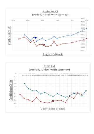 This document summarizes Rishabh Verma's graduate final project involving the modeling and analysis of a multi-element rear wing for a race car using CAD/CAM software. The project objectives are to model various wing profiles with and without a Gurney flap in SolidWorks and analyze the downforce, drag, and angle of attack using OpenFOAM computational fluid dynamics software. The document provides background on airfoil theory, descriptions of the modeling and analysis software used, sample airfoil coordinate data and wing profiles, and preliminary results analyzing drag force, lift force, and lift-to-drag ratio at different angles of attack.