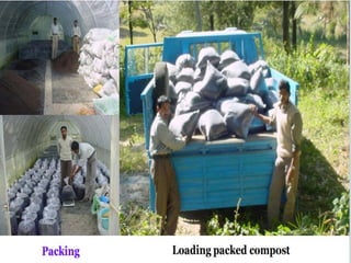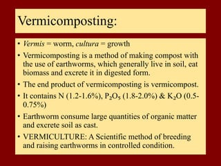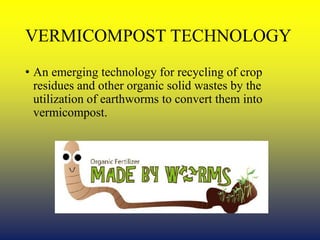 Vermicomposting is a method of using earthworms to convert organic wastes like crop residues into a nutrient-rich compost called vermicompost. Earthworm species like Eisenia foetida and Erudrilus evegeniae are commonly used. The earthworms physically aerate, crush, and mix the materials while chemically degrading and biologically stimulating decomposition. Vermicompost contains higher levels of nutrients like nitrogen, phosphorus, and potassium than traditional composts. The vermicomposting process involves layering organic materials and bedding in a pit or heap, maintaining suitable moisture, temperature, and aeration conditions for the earthworms to feed and produce castings, which