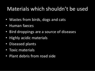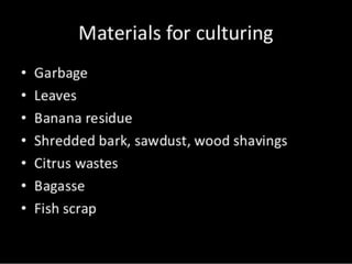 This document discusses vermiculture, which is the practice of raising earthworms to produce vermicompost and other products. It describes the different types of earthworms used, including anecic, endogeic, and epigeic worms. Methods of vermiculture discussed include windrow composting and bin systems. Key factors for successful vermiculture are selecting the proper earthworm species, density, temperature, moisture, and bedding/feeding materials. Vermiculture has economic and environmental benefits, converting organic wastes into nutrient-rich fertilizer to improve soil quality and plant growth.