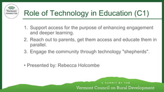 This document outlines ideas and suggestions from a day-long summit on Vermont's digital economy. It includes 9 sections, each presenting 3-4 ideas on a topic such as the role of technology in education, solving the digital divide, how non-profits and small businesses can utilize technology, how technology can enhance open government, resilience and community, fostering new tech industries, valuing broadband access, and addressing poverty and inequality through technology. The overall goal is to provide guidance on harnessing technology to improve various sectors in Vermont.