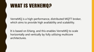 Vernemq is a high-performance, distributed MQTT broker designed for high availability and scalability, utilizing Erlang for effective multi-core architecture support. The document provides an overview of MQTT protocols, settings up Vernemq, its features, including file-based authentication, access control, session balancing, and clustering methods. It also details a testing setup with client and broker configurations to assess performance under various loads.