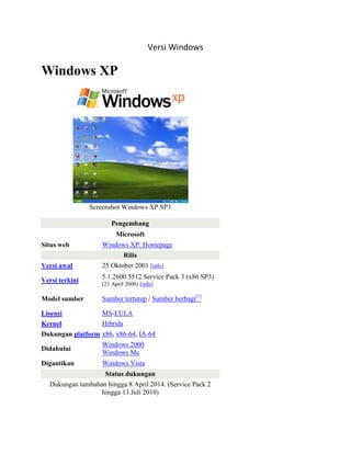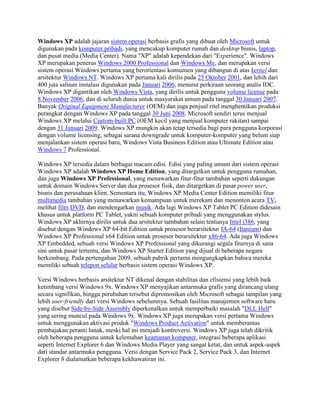 Windows XP adalah sistem operasi Windows yang dirilis pada 2001 untuk menggantikan Windows 2000 dan Windows Me. Windows XP menawarkan antarmuka pengguna yang lebih ramah dan stabil dibanding versi Windows sebelumnya. Windows XP digantikan oleh Windows Vista pada 2007.