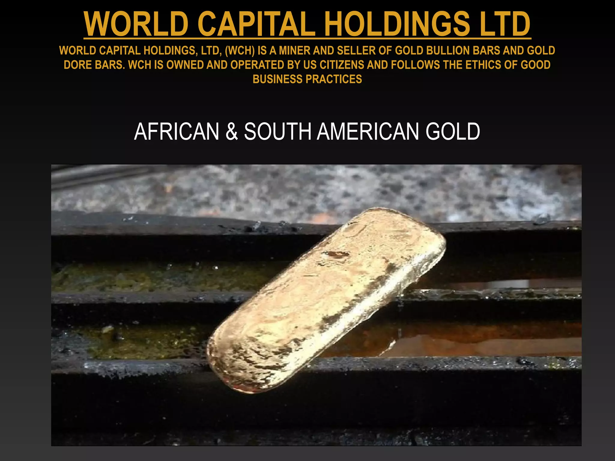 World Capital Holdings, Ltd (WCH) is a miner and seller of gold bullion bars and gold dore bars. WCH mines gold in Africa and South America, refining it into gold bars. The company is owned and operated by US citizens and follows ethical business practices. WCH invites potential buyers to visit its mining sites and refineries to ensure transparency. It offers multiple secure payment and delivery options to buyers around the world.