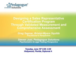 The document outlines a certification program for sales representatives, including design, development, and evaluation processes. It emphasizes the importance of valid assessments, governance, job competency analysis, and legal considerations in certification, particularly in the pharmaceutical industry. Participants in the workshop will learn about the different types of certification, competitive advantages, and the steps necessary to implement an effective certification process.