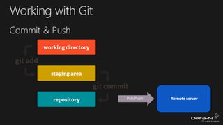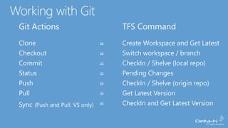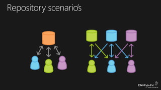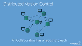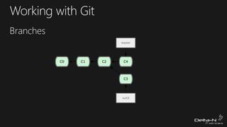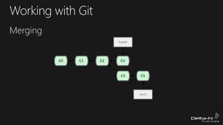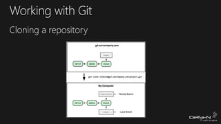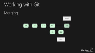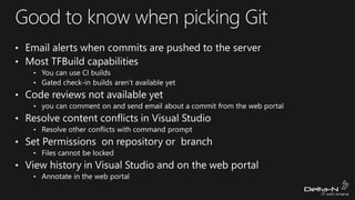 The document discusses the strengths and features of Git, highlighting its scalability for large codebases, fine-grained permission control, and offline editing support. It emphasizes Git's growing adoption and integration with various platforms, specifically noting tools supporting Linux and Mac, as well as its integration into Visual Studio. Additionally, it provides contact information for Delta-N BV, along with links to further resources and social media.