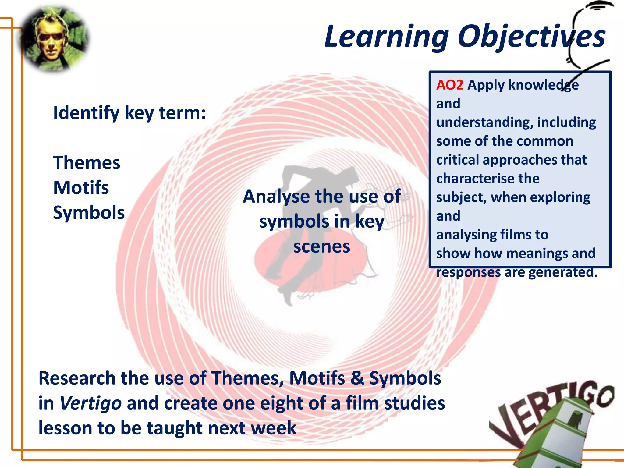 This document provides learning objectives and instructions for analyzing the themes, motifs, and symbols in the film Vertigo. It defines key terms like themes, motifs, and symbols. It instructs students to research these elements in Vertigo and create a lesson on them to be taught the following week. Examples discussed include the themes of death, romance, and identity, as well as motifs like spirals and symbols like the sequoia trees and color green. Students are told to analyze how these elements are used in specific scenes and include information from outside research.