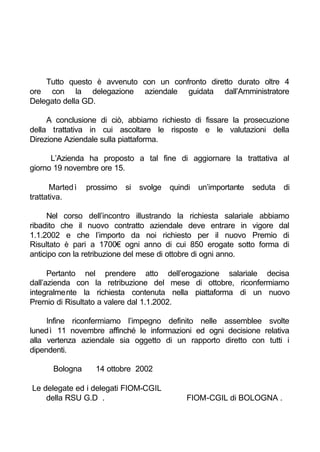 Il 8 novembre è iniziata la trattativa per rinnovare il contratto aziendale della GD, con un focus sulle richieste dei dipendenti espresse in una piattaforma approvata da 930 lavoratori. Durante l'incontro, la RSU ha richiesto chiarezza sulle richieste e ha confermato una richiesta salariale di 1700€ annui a partire dal 1 gennaio 2002. La prossima seduta di trattativa è prevista per il 19 novembre, dove si attende una risposta dall'azienda.