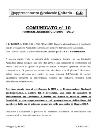 Il 6 settembre 2007, la rsu-g.d e i sindacati Fim-Fiom-Uilm di Bologna riprenderanno il confronto per il rinnovo del contratto aziendale, fondamentale dopo la scadenza del 2006. Due incontri sono previsti per il 12 e 13 settembre; se non ci saranno progressi significativi, seguiranno mobilitazioni e blocchi delle forme di flessibilità. Si invitano i lavoratori a prestare attenzione ai futuri comunicati.