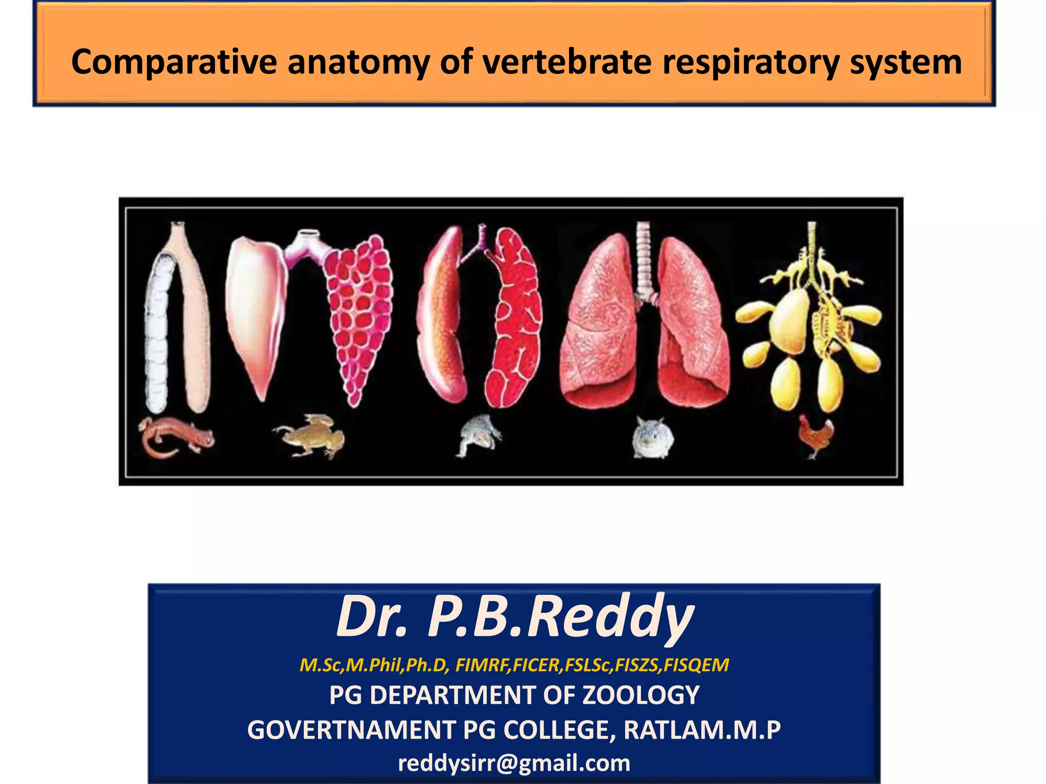 Dr. P.B.Reddy provides an overview of the comparative anatomy of the vertebrate respiratory system. The document discusses why animals need to breathe and defines internal and external respiration. It then describes the key characteristics and functions of respiratory organs across different vertebrate groups, including fish, amphibians, reptiles and others. Specific structures are examined such as gills, lungs and the mechanisms of gas exchange that occur.