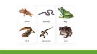 Vertebrates are characterized by having a backbone, skull, and internal skeleton. They include fish, amphibians, reptiles, birds, and mammals. Fish live exclusively in water and have fins and scales. Amphibians can live on land and in water, are ectothermic, and have moist skin. Reptiles are amniotes that lay shelled eggs and most have scales and four legs. Birds are endothermic, lay shelled eggs, have feathers, beaks, and wings. Mammals are endothermic and feed their young with milk produced by mammary glands.