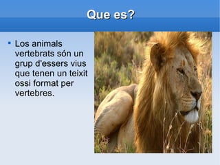 Que es? Losanimals vertebrats són un grup d'essers vius que tenen un teixit ossi format per vertebres.