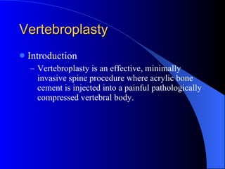 Vertebroplasty is a minimally invasive procedure for treating painful vertebral compression fractures, providing immediate pain relief and preventing further vertebral collapse. Historically, it utilizes acrylic bone cement and has efficacy rates of 80-90% for osteoporotic fractures and 70% for neoplastic fractures, with low complication rates. Patient selection is crucial, focusing on recent fractures and excluding those with contraindications such as uncorrected coagulopathy or severe spinal canal encroachment.