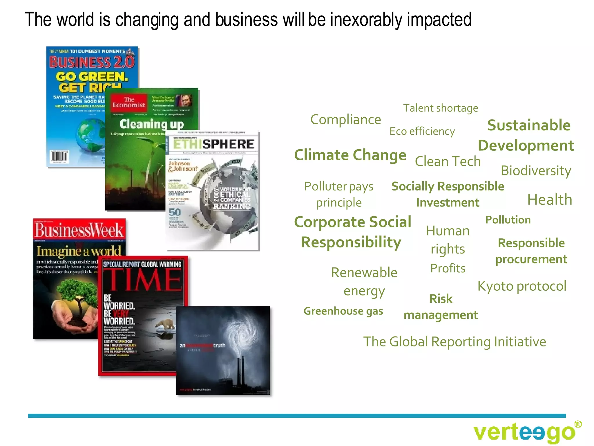 Verteego promotes corporate social responsibility (CSR) and sustainable business practices, highlighting their significance in mitigating risks and enhancing profitability for companies. The platform provides tools for small and medium enterprises to manage their sustainability efforts effectively and offers insights into eco-efficient operations and responsible procurement. By embracing sustainability, businesses can improve their reputation, innovate, and attract responsible customers while minimizing costs and competition.