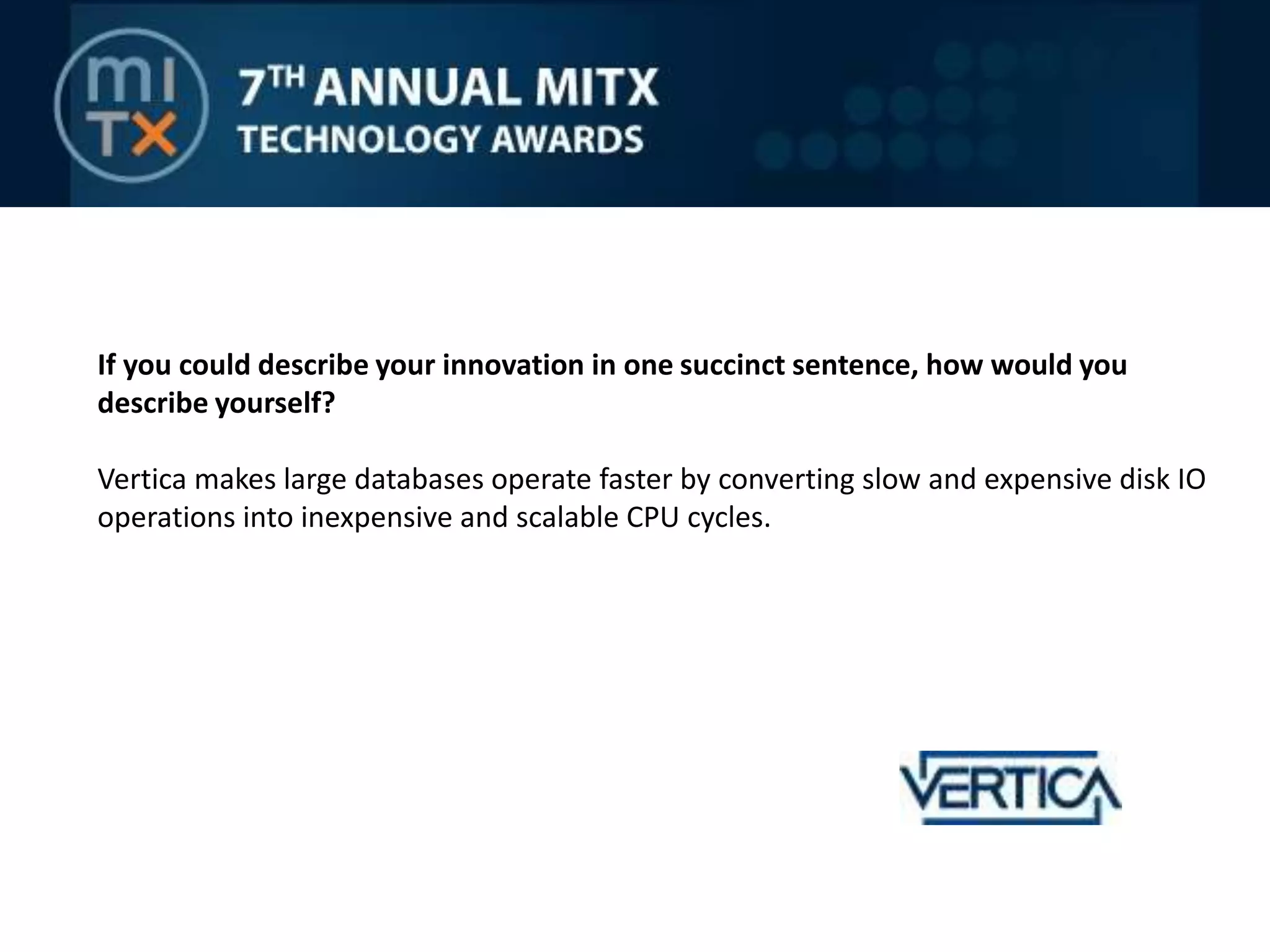 Vertica is an innovative company that enhances the performance of large databases by transforming slow disk operations into efficient CPU cycles. Founded by Dr. Michael Stonebraker through collaborative research, Vertica offers a next-generation database technology that significantly benefits customers compared to existing solutions. In just two and a half years, the company achieved its milestone of acquiring 100 customers, with its core technology and team being its greatest assets.