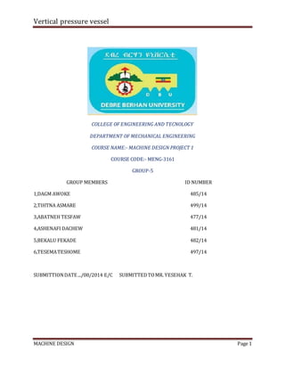 This document provides details on the design of a vertical pressure vessel, including: