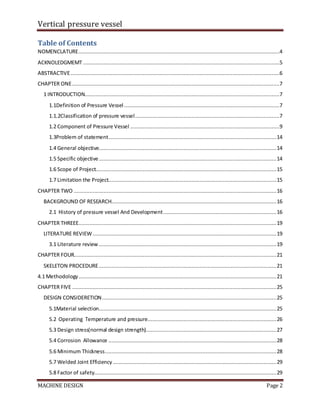- The document presents the table of contents and nomenclature for the pressure vessel design project. It acknowledges the course instructor and provides an abstract of the work.