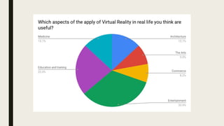 This document summarizes a student project presentation on virtual reality (VR). It introduces VR and its current developments, applications, and advantages/disadvantages. Data was collected through an online survey and websites. VR uses computer generation to immerse users in virtual environments through displays and audio. Key developments included the naming of VR in 1987 and its growth into a $215 billion market by 2021. Applications of VR discussed are entertainment, commerce, medicine, and education. Benefits of educational VR include outstanding visualizations and increased student engagement, while disadvantages can be deteriorated human connections and addiction to the virtual world.