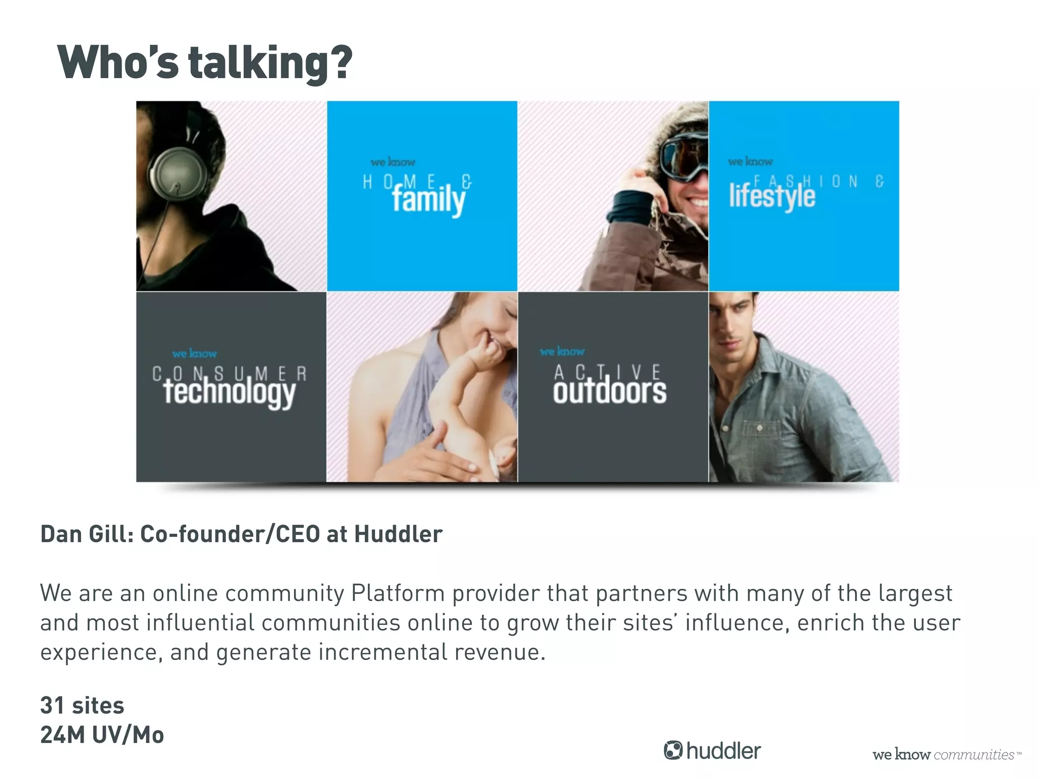 Dan Gill, co-founder of Huddler, discusses the evolution of online communities focusing on interest-based networks versus social networks for monetization. He highlights that users are more engaged in interest graphs where their passions drive influence, resulting in longer-lasting conversations and brand advocacy. The document outlines strategies for brands to leverage these communities to change perceptions and amplify their reach through enthusiastic advocates.