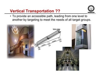 This document provides information about vertical transportation in buildings, focusing on stairs and elevators. It defines stairs and their key components such as treads, risers, and handrails. It describes different types of stairs including straight, dog-legged, and spiral. Design considerations for stairs like width, headroom, and dimensional standards are covered. Common materials for stair construction like timber, stone, concrete, and their properties are discussed. Elevator components like the machine room, hoistway, cabs, and controllers are defined. The main types of elevator systems - traction and hydraulic - are outlined.