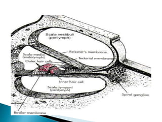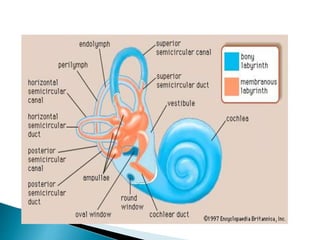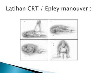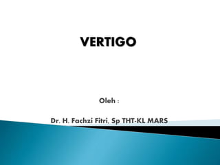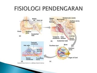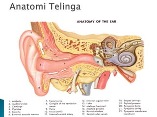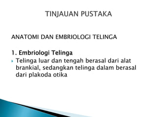 Dokumen ini menjelaskan anatomi dan embriologi telinga, termasuk perkembangan telinga luar, tengah, dan dalam, serta struktur dan fungsinya. Telinga memiliki peran penting dalam pendengaran dan keseimbangan tubuh, dengan beberapa kondisi yang dapat memengaruhi fungsi ini, seperti vertigo. Selain itu, faktor-faktor predisposisi dan gejala terkait gangguan telinga juga dibahas.
