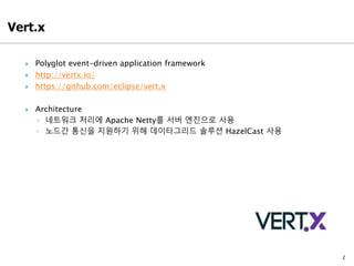 Vert.x and Akka are both polyglot event-driven application frameworks. Akka is based on the actor model of concurrency using message passing between actors. Vert.x uses an event bus for communication and relies on Hazelcast for distributed communication. While Vert.x does not have recovery systems, Akka supports flexible recovery through various persistence systems. The creator of Vert.x respects Akka and sees the two frameworks working together in reactive applications.