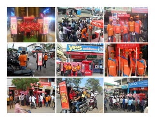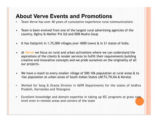 Verve Events and Promotions is an experiential marketing agency with over 40 years of experience in rural communications. They have a presence in over 175,000 villages and 4,000 towns across 21 Indian states. The agency focuses on rural and urban activations to understand client needs and fulfill requirements through creative concepts. They have the reach to conduct activities in villages with populations of 500-10,000 and urban areas with over 100,000 people in South Indian states. Some of their services include consumer insights, strategic planning, branding, communication packages, on-ground activations, and large-scale rural and urban executions. They have experience with promotional campaigns for brands across various categories.
