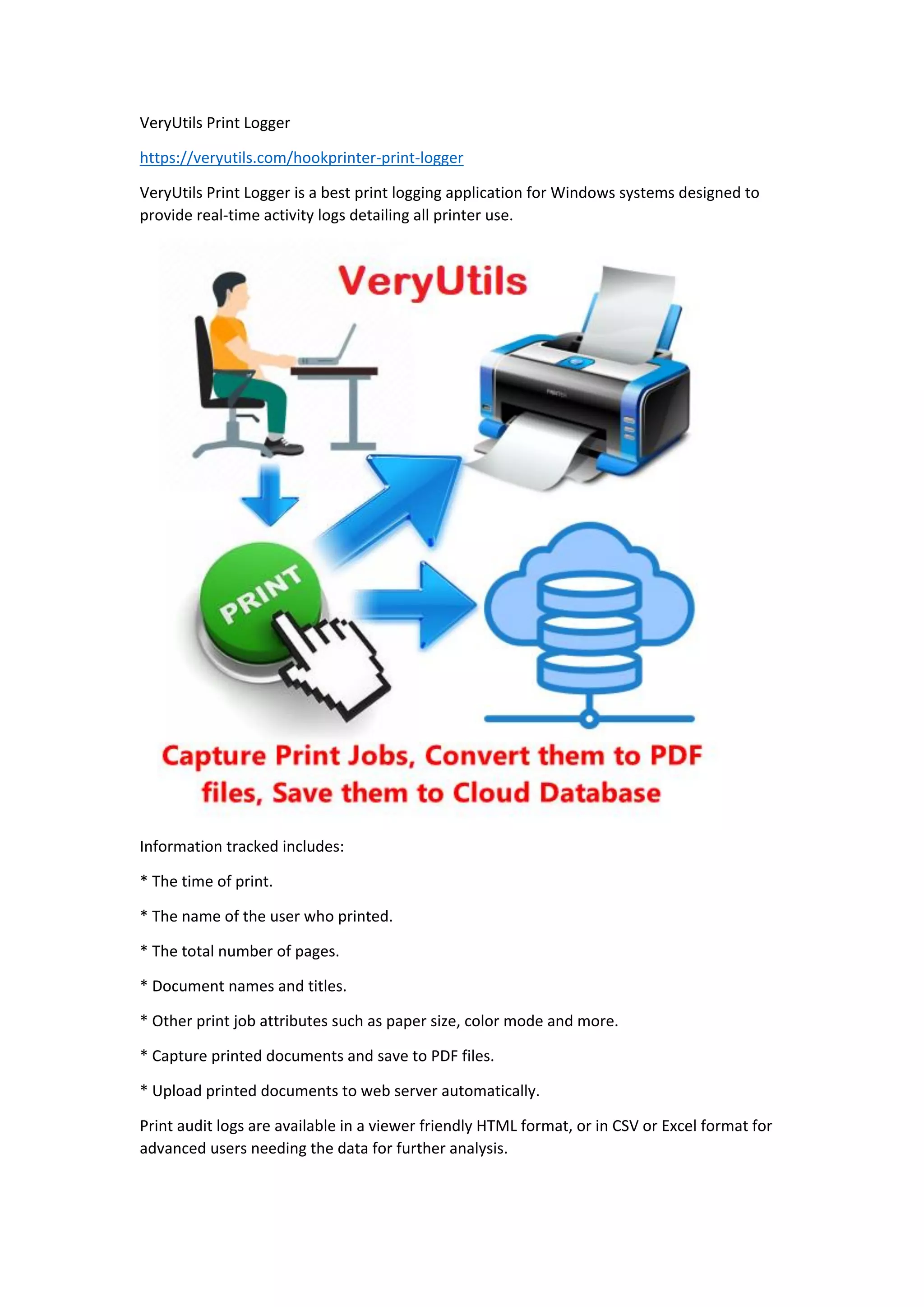 Veryutils Print Logger is a Windows application for logging printer activity in real-time. It tracks key information such as print time, user names, page counts, and document details, and it can save printed documents as PDFs or upload them to a web server. Print audit logs are accessible in HTML, CSV, or Excel formats for user analysis.