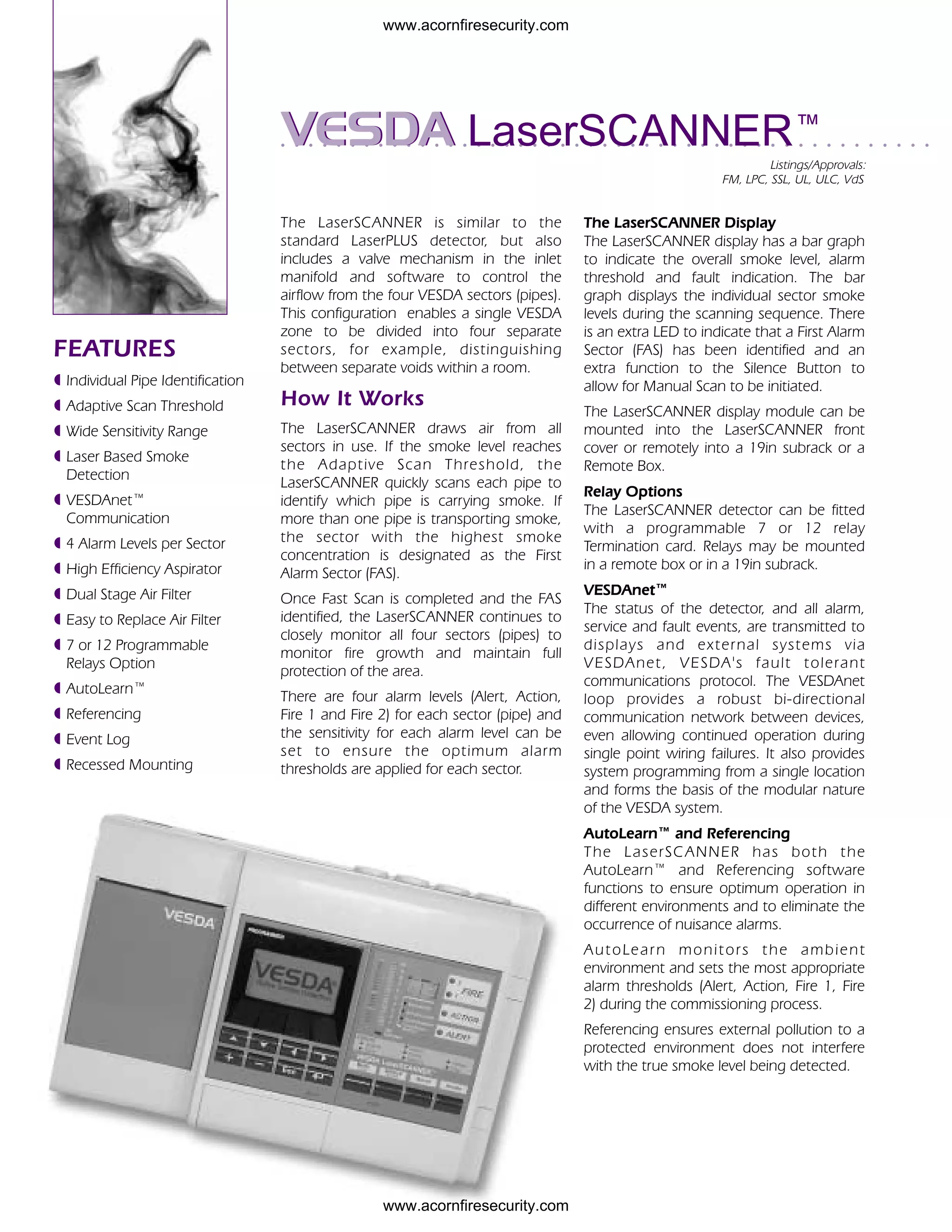 The LaserSCANNER is a VESDA air sampling smoke detector that can divide its detection area into four separate sectors. It draws air from all sectors and uses a laser to quickly scan and identify which sector is carrying smoke during an alarm. It has adjustable alarm thresholds for each sector to optimize detection. Key features include individual sector identification and monitoring, adaptive scanning, VESDAnet communication, and software for automatic setup and environmental compensation.