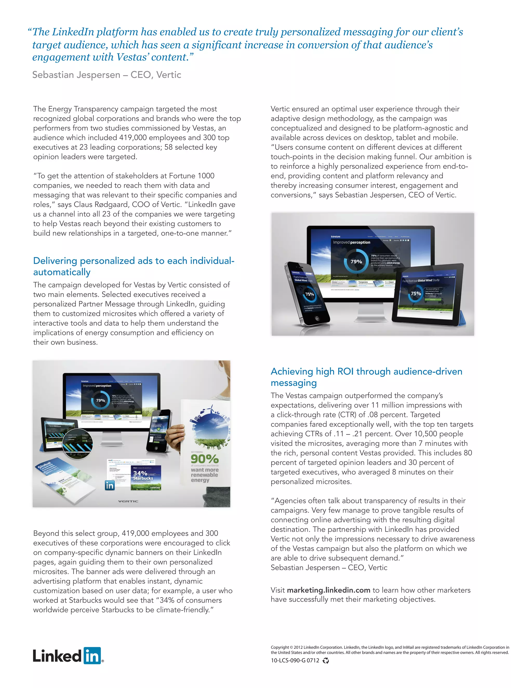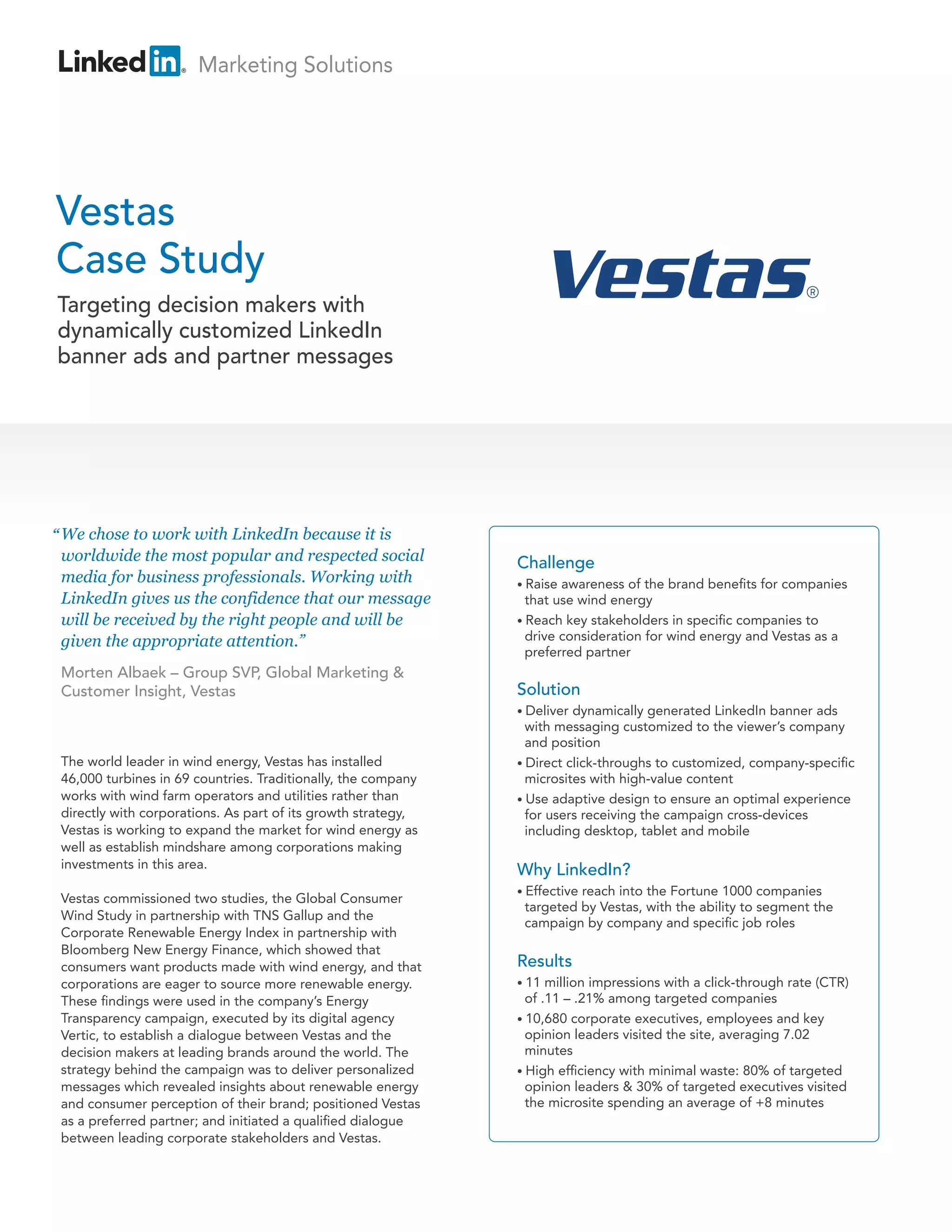 Vestas, the world leader in wind energy, partnered with LinkedIn and Vertic to launch an awareness campaign targeting decision makers at Fortune 1000 companies. The campaign delivered dynamically customized banner ads and messages to over 419,000 employees and 300 executives. It also directed users to company-specific microsites containing insights about renewable energy and Vestas. The campaign achieved over 11 million impressions with high click-through rates. It drove over 10,000 visitors who spent an average of 7 minutes on the personalized microsites. The campaign successfully expanded Vestas' reach and positioned them as a preferred partner among corporate stakeholders.