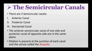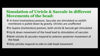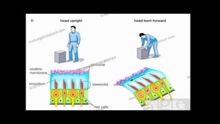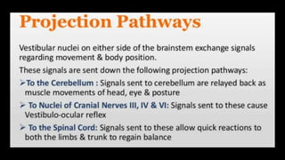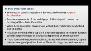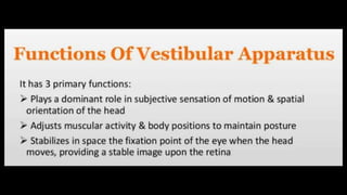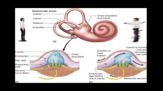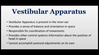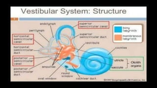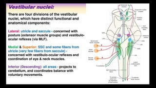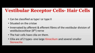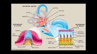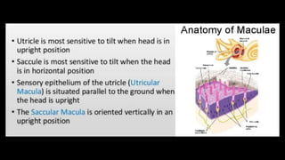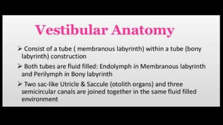 The document discusses the anatomy and physiology of the vestibular system, emphasizing key structures such as the utricle, saccule, and semicircular canals involved in balance. It details how hair cells in the peripheral vestibular organs transmit sensory information to the brain, facilitating reflexes necessary for maintaining orientation during head movements. Additionally, it references various studies and audiology resources on vestibular functions and includes questions related to the system's role in maintaining balance.