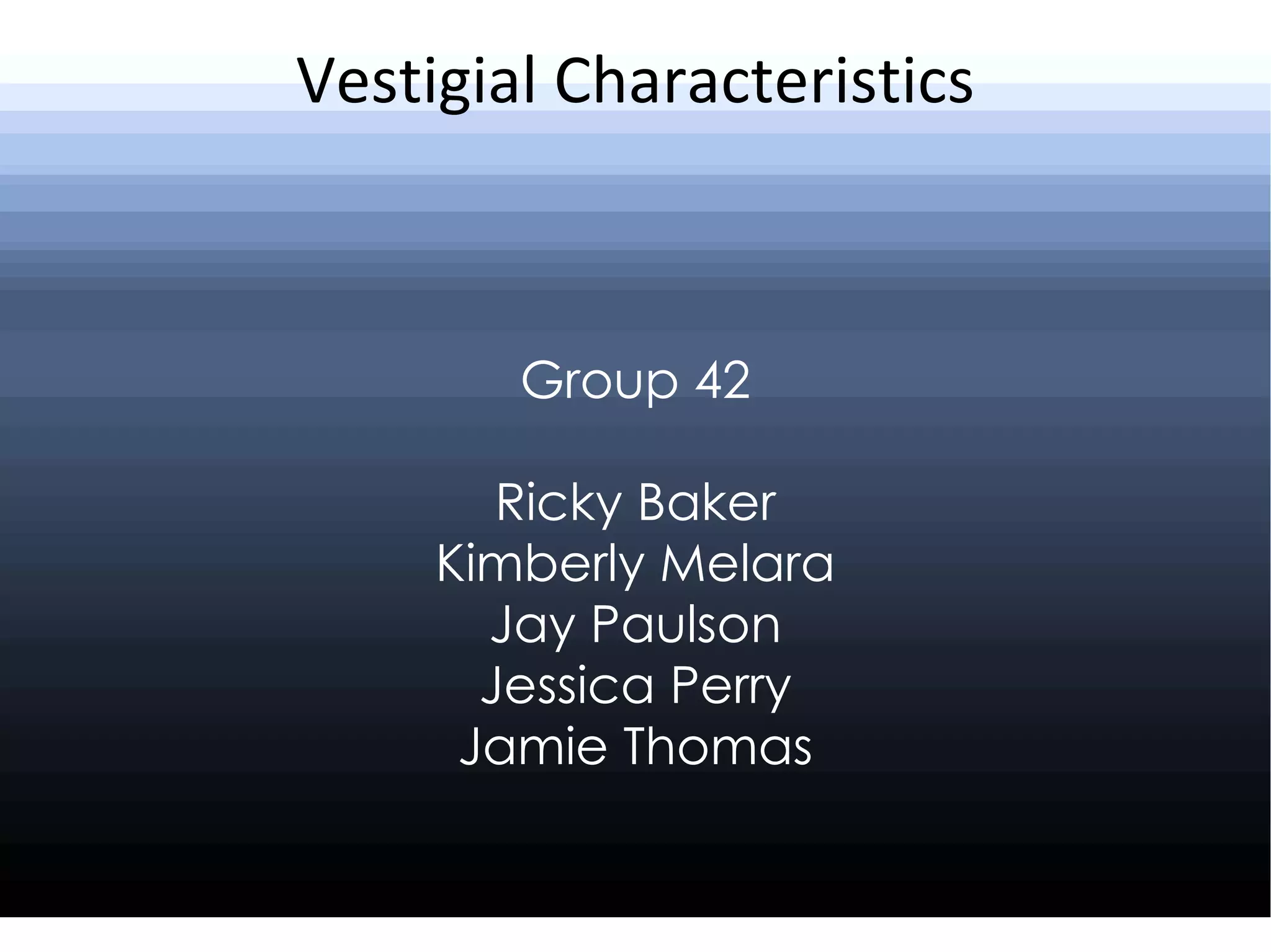 3) Examples of human vestigial structures include the tailbone, wisdom teeth, goosebump-causing muscles, and the ability to wiggle ears. Other animals like whales and moles also have vestigial structures.