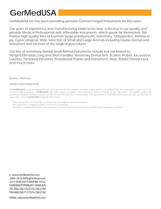 GerMedUSA Inc. provides high quality German surgical instruments for medical and veterinary professionals. They offer a wide selection of instrument sets for procedures like dentistry. Their instruments are guaranteed for life against defects. They market lines of instruments for procedures like orthopedics, gynecology, and more. They also provide veterinary dental instruments for small and large animals, including equine dental instruments and sets.