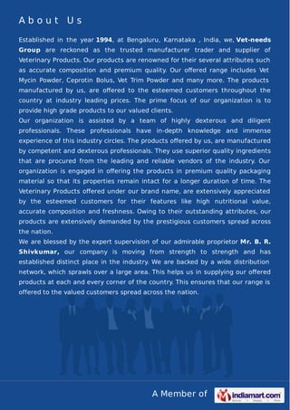Vet-Needs Group, established in 1994 in Bengaluru, Karnataka, is a leading manufacturer and supplier of veterinary products recognized for their high quality and accurate composition. The organization offers a variety of products, including powders, boluses, and liquids, dedicated to providing exceptional veterinary solutions supported by a skilled team and a wide distribution network. Their commitment to quality and nutritional value has earned them a strong reputation and demand throughout India.
