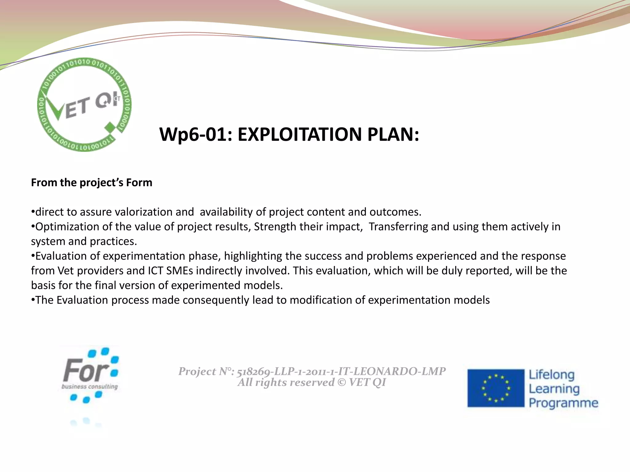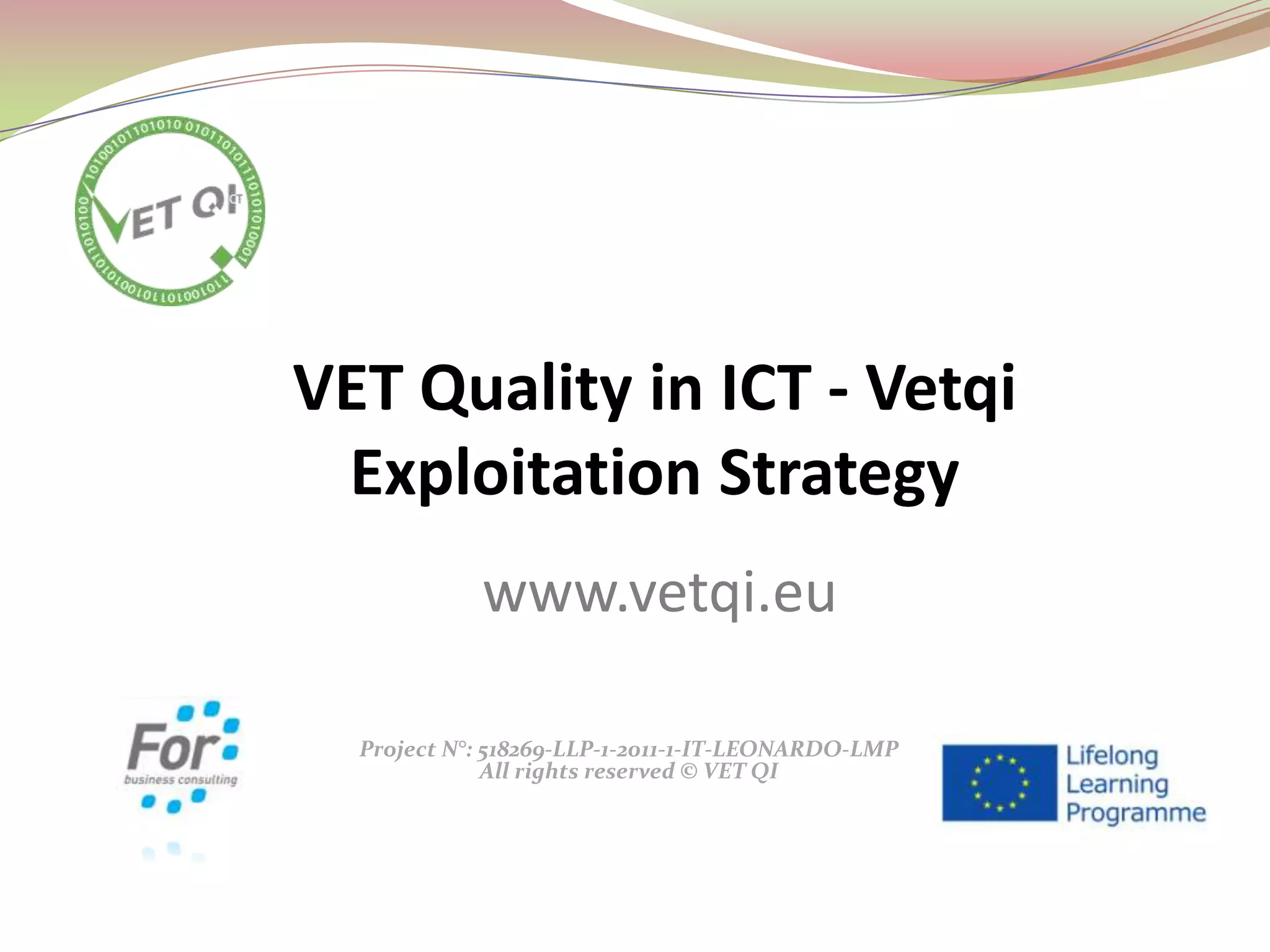The VetQI project aims to enhance quality assurance in vocational education and training (VET) through a structured exploitation strategy that includes a certification system, evaluation guides, and support networks for VET providers and ICT SMEs. Key outputs include the VetQI Quality Label, manuals for target groups, and a system to assess quality adherence. The project seeks to build a network of supporters and engage stakeholders to promote quality standards across the sector.