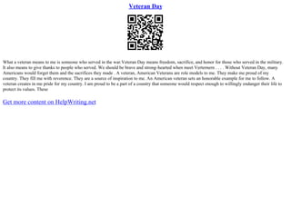 Veterans Day is a day to honor American veterans for their service and sacrifice. It is important to show gratitude to all veterans, including those who did not return from war, for protecting the country's freedom. Students should learn about the meaning of Veterans Day and why it is celebrated so they understand the importance of honoring veterans.