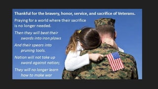 This document expresses appreciation for veterans and their service on Veterans Day, emphasizing the importance of their sacrifices for freedom and democracy. It includes quotes from various individuals about the value of veterans and the meaning of their service. The staff and students of CMS celebrate this day by offering breakfast and entertainment to honor them.