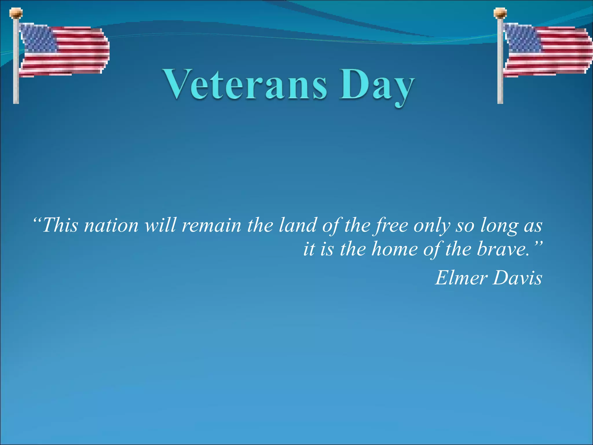 Veterans Day is celebrated annually on November 11th to honor military veterans. It originated as Armistice Day after World War I to commemorate the end of that war. The name was later changed to Veterans Day to honor all veterans who have served in the US military. Common ways of celebrating include parades, memorial ceremonies, and thanking individual veterans for their service and sacrifice.