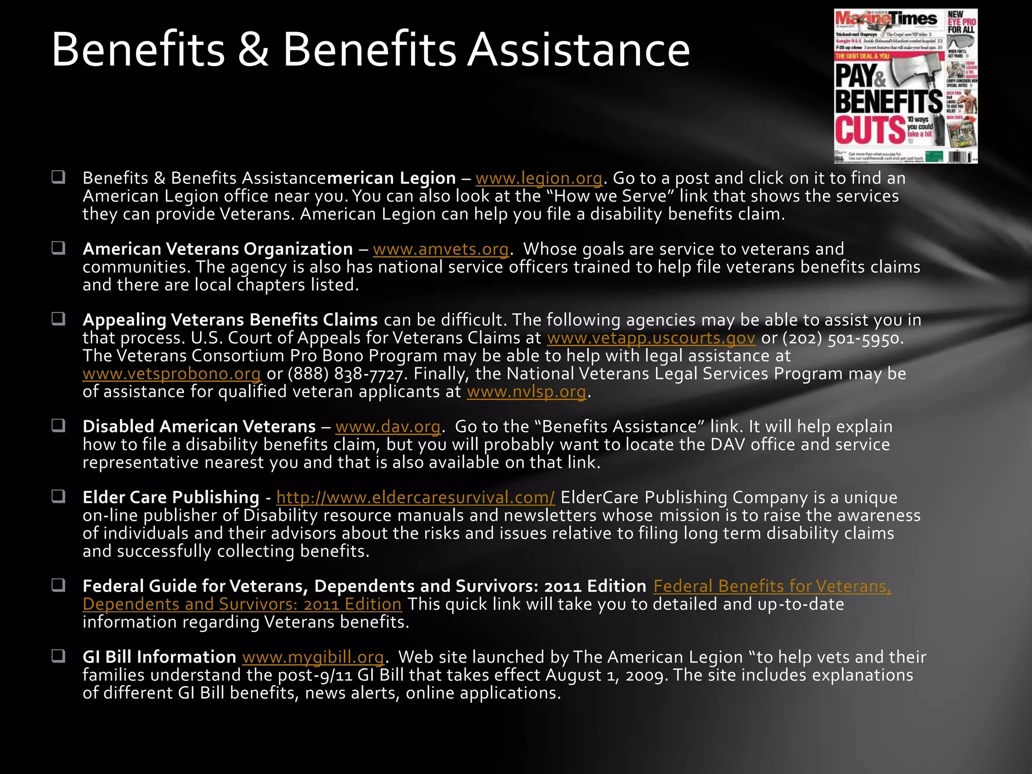 This document provides resources for veterans regarding benefits and assistance, counseling, employment, financial aid, credit for military training, and assistance for homeless veterans. It lists various organizations that can help with filing disability claims and benefits, mental health counseling, job searching, financial assistance for education, and translating military experience to college credit. Contact information and websites are provided for agencies such as the VA, American Legion, VFW, and others to help veterans access services.
