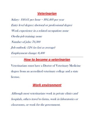 Veterinarians care for the health of animals and work to improve public health by diagnosing, treating, and researching medical conditions and diseases. They require a Doctor of Veterinary Medicine degree and state license. The median salary is $84,460 per year and employment is projected to grow 12% from 2012-2022, about average. Competition for jobs is strong so specializations and experience provide advantages.