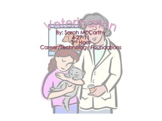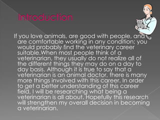 A veterinarian cares for animals by performing surgeries, treating diseases, prescribing medicine, and educating owners. The job requires graduating from veterinary school with a DVM degree. Veterinarians work indoors in sanitary conditions or outdoors in all weather treating livestock. Employment is expected to grow 33% by 2018, especially in rural areas. While the work has challenges like risky animal interactions and long hours, salaries average $93,398, making it rewarding to save animals' lives.