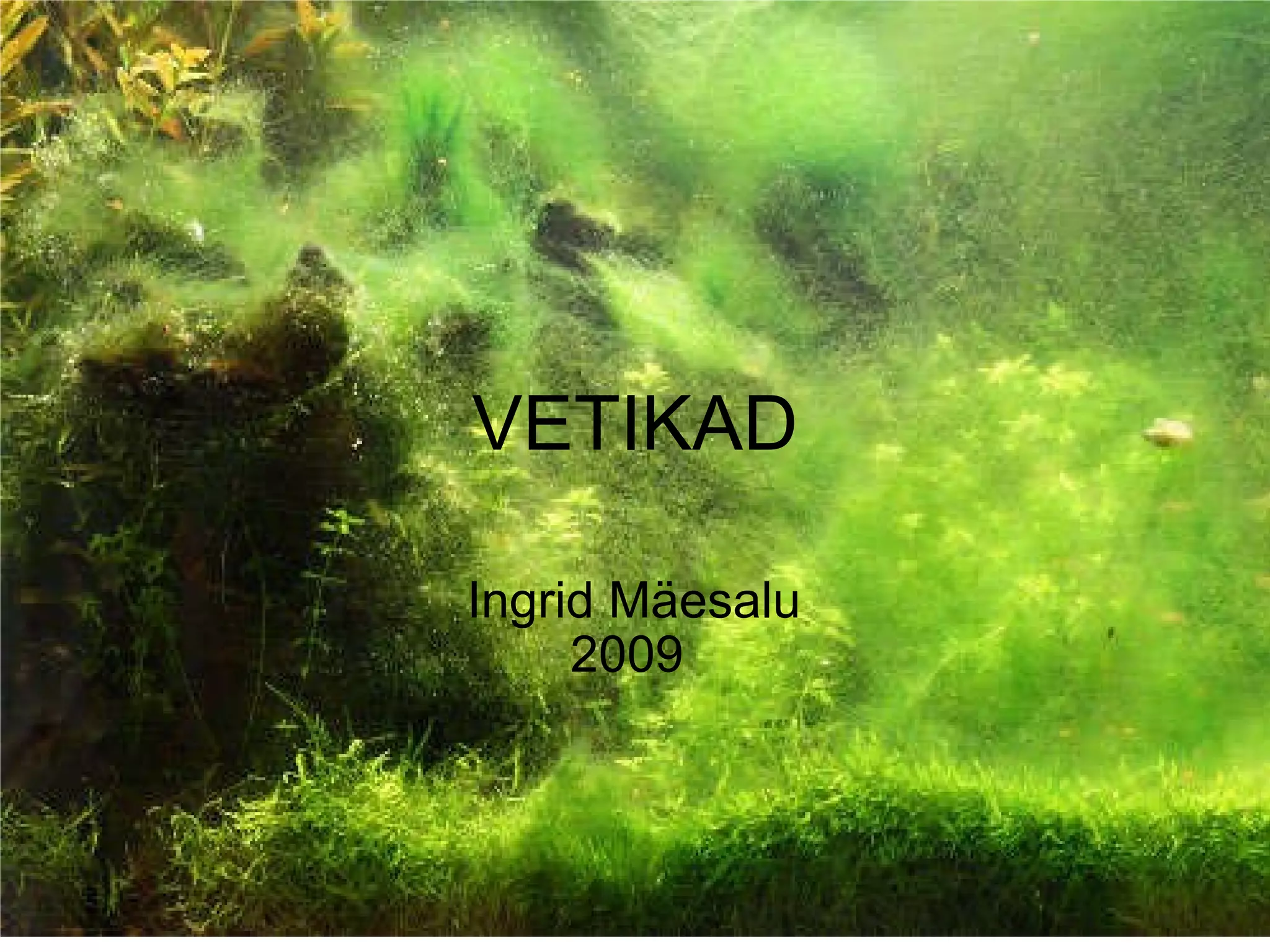 E vetikadKasutatud kirjandus:Toom, M., Kokassaar, U., martin, M. 2008. Bioloogia 8. klassile I osa. Pildid: www.networkroundtable.org/.../2009/01/algae.jpg miksike.ee/docs/referaadid2005/vetikad_teele.jpg bio.edu.ee/taimed/vetikas/images/koppvet.jpg bio.edu.ee/taimed/vetikas/images/klorella.jpg www.microscopy-uk.org.uk/.../chlorella.jpg protist.i.hosei.ac.jp/.../Apatococcus/sp_1c.jpg www.bhikku.net/archives/03/img/volvox.jpg www.euita.upv.es/.../Pediastrum.gif www.botany.ut.ee/~olli/PE/chlmy2.png farm1.static.flickr.com/187/418905850_35aa276.. bio.edu.ee/taimed/vetikas/images/vjuus.jpg et.wikipedia.org/wiki/Keermikvetikas www.koolielu.edu.ee/.../karevetikas.jpg commons.wikimedia.org/wiki/File:Cladophora.JPG
