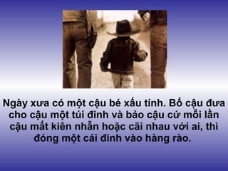 Câu chuyện kể về một cậu bé học cách tự kềm chế qua việc đóng đinh vào một hàng rào khi cậu mất kiên nhẫn, nhận ra rằng hành động này tạo ra những vết thương khó xóa nhòa như những lời nói sai trái. Qua thời gian, cậu không còn đóng đinh nữa và nhổ những cái đã đóng, nhưng vẫn thấy rõ những vết thương do hành động của mình gây ra. Bài học nhấn mạnh tầm quan trọng của tình bạn, sự tôn trọng bản thân và người khác, cũng như trách nhiệm với lời nói và hành động của mình.