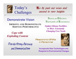 This document summarizes the executive director's report from the NELINET Annual Meeting. It discusses the challenges libraries are facing today including demonstrating vision, serving as effective stewards of resources, coping with exploding content, responding to personnel shifts, incorporating new technologies, improving services, and updating facilities. It also discusses trends toward radical transparency, democratization of technology, and user-centered innovation. The report outlines NELINET's transformation from solely being a broker and licensor to an innovation enabler and discusses services to help members contain costs and improve quality.