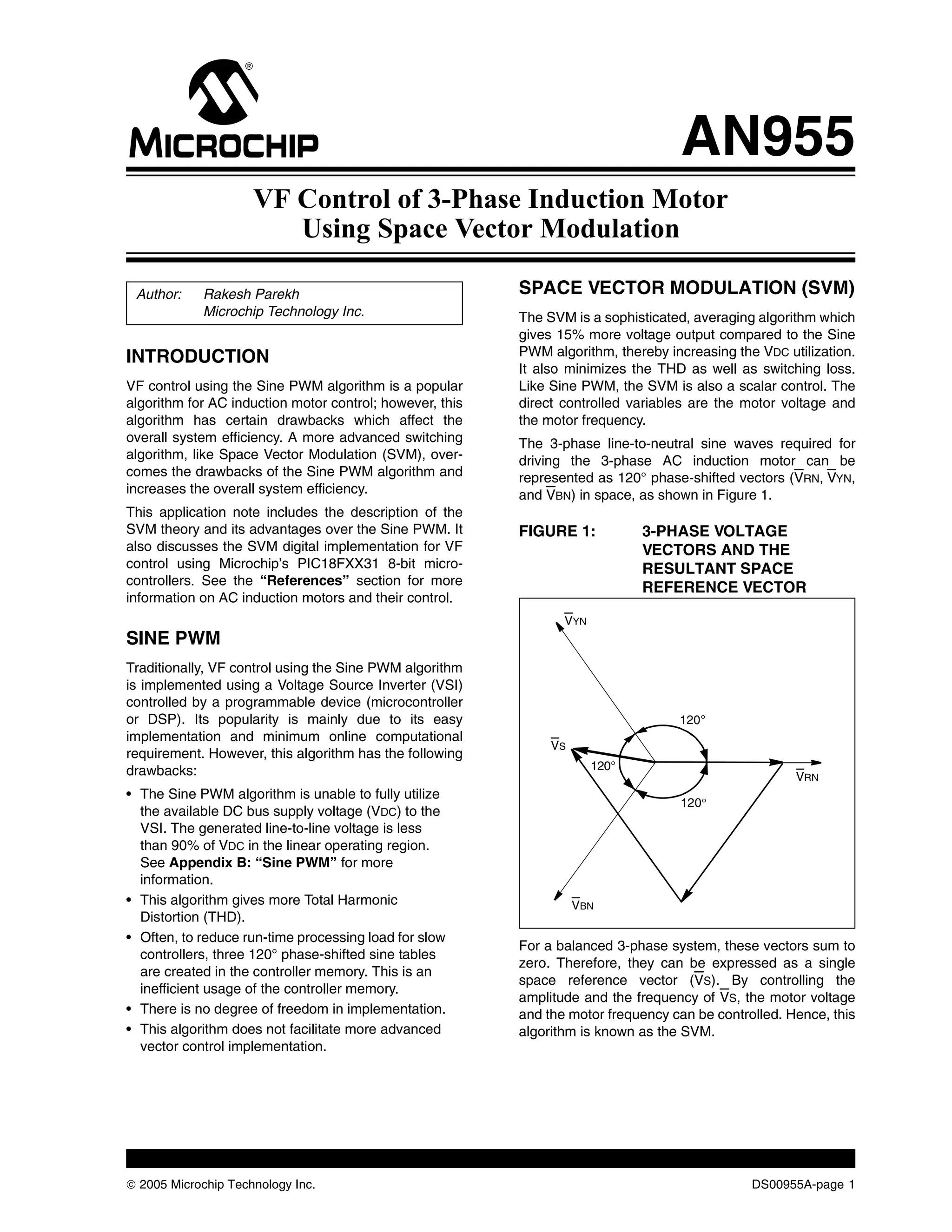 The document describes space vector modulation (SVM), an advanced switching algorithm for voltage source inverters that controls AC induction motors. SVM gives 15% more voltage output compared to sine PWM, improving voltage utilization and minimizing total harmonic distortion and switching losses. It represents the three-phase motor voltages as vectors in space and controls motor voltage and frequency by controlling the amplitude and frequency of the reference space vector. The SVM algorithm allows generating the maximum possible line-to-line voltage of the DC bus supply voltage, improving motor torque and dynamic response over sine PWM.