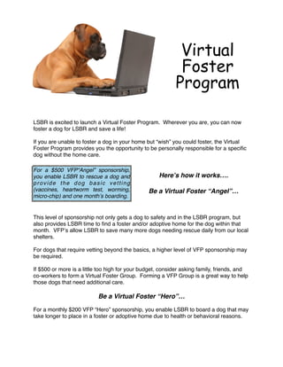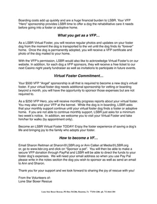 The document introduces a Virtual Foster Program run by Lone Star Boxer Rescue (LSBR) that allows individuals to sponsor and support specific dogs in the rescue without having to foster the dog in their home. For a $500 sponsorship, LSBR will provide a dog with basic vetting and one month of boarding to get the dog to safety while a foster home is found. A $200 per month sponsorship will support dogs with longer term boarding needs. Virtual fosters receive updates on their sponsored dog and a certificate once permanently adopted.