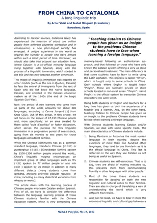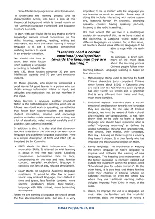 1. The document discusses the learning process of Chinese students learning Catalan and Spanish in Catalonia. It describes differences between the Chinese and Catalan education systems and challenges Chinese students face in learning a language with a different alphabet and grammar.