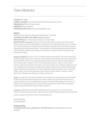 This pilot study explored the use of Ayurvedic treatment for inflammatory bowel disease (IBD) in 13 patients, aged 12 to 62, alongside their recommended medical treatment. Of the patients who continued with Ayurvedic methods, they reported an average symptom relief of 84% without adverse effects, but follow-up data is limited with only five patients staying in the study for an average of 21.8 months. The findings suggest that Ayurvedic lifestyle changes and herbal supplements could benefit IBD patients, warranting further research to validate the results.