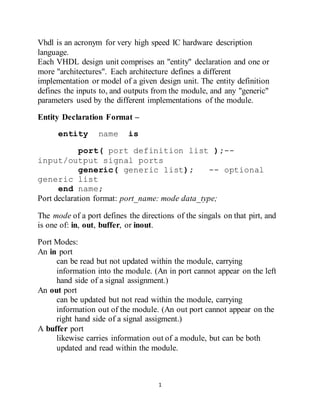 VHDL is a hardware description language used to model electronic systems. A VHDL design unit consists of an entity declaration defining inputs and outputs, and one or more architecture bodies implementing the design. Architectures can model designs at different levels of abstraction such as behavioral, dataflow, or structural. Packages allow reusable code to be organized and shared between designs through declarations and bodies.