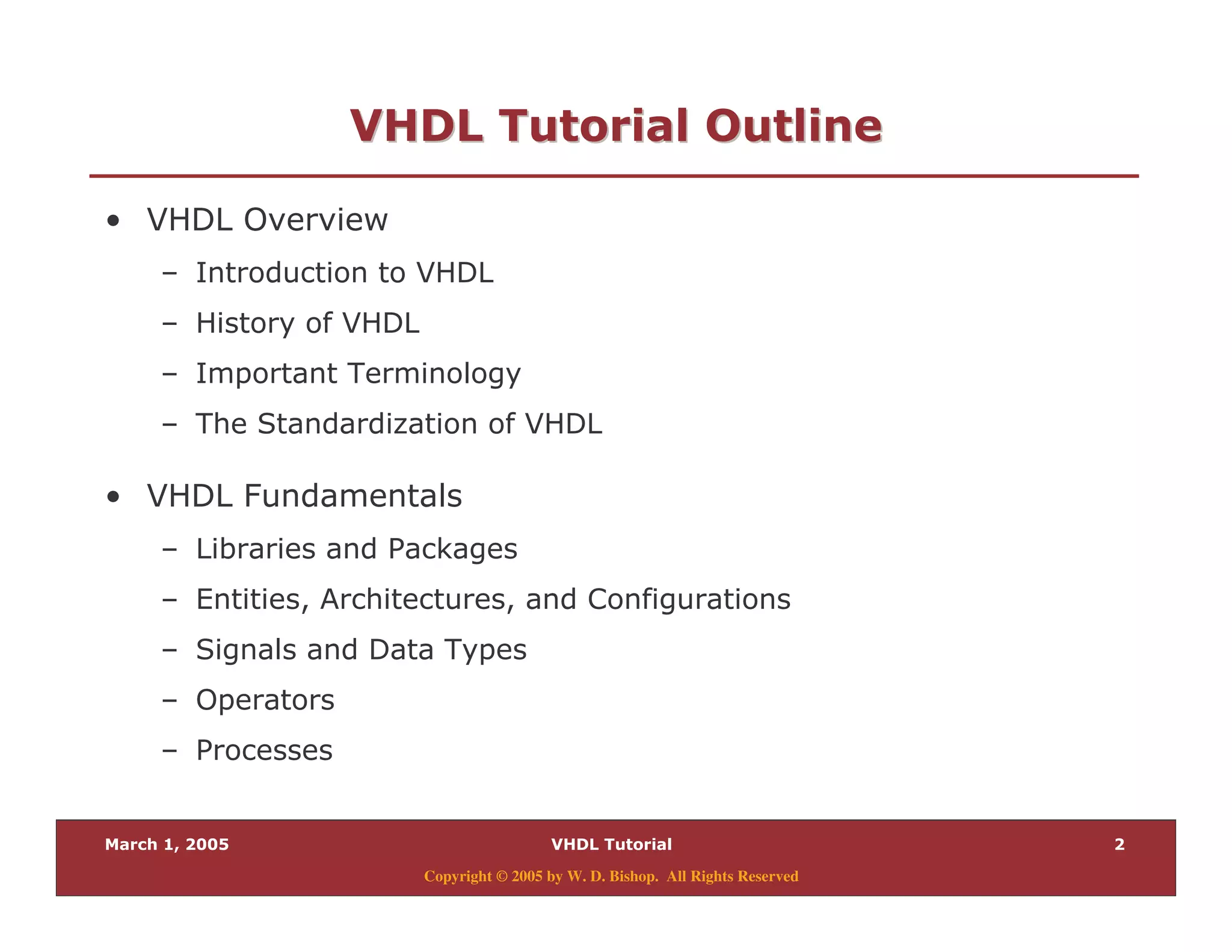 This document provides an introduction and overview of VHDL (VHSIC Hardware Description Language). It defines VHDL, describes its uses for hardware description and simulation, and outlines some key components of VHDL including entities, architectures, configurations, processes, signals, and concurrent signal assignments. It also provides examples of VHDL code for simple logic gates and sequential logic.